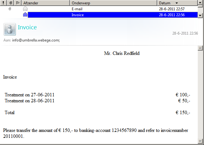The same example invoice but sent by e-mail, displayed in Windows Live Mail 2011.