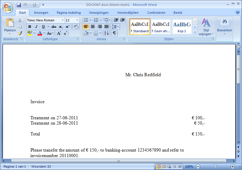 An example invoice, displayed in Microsoft Word 2007. The invoice combines two appointments.