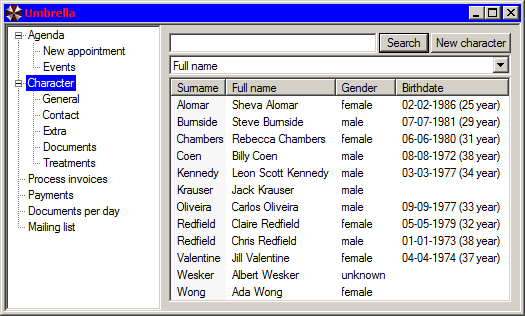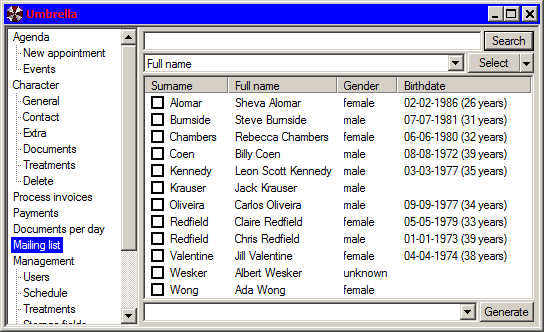 Selection screen for customers/patients/clients.