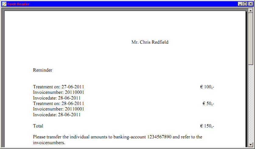 A reminder example, printed to a virtual PDF-printer and displayed in Foxit Reader. The reminder contains all the unpaid invoices.